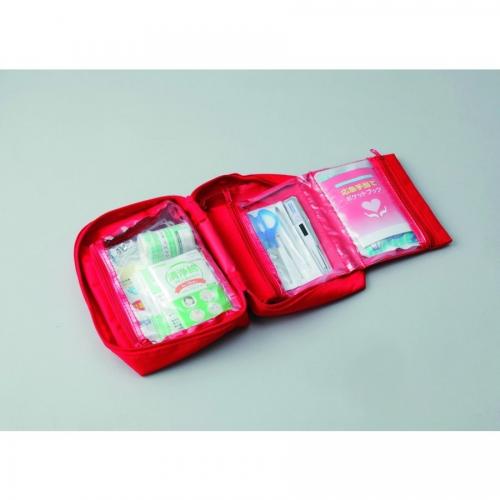 セット内容 救急バック、カット綿×3枚、カットガーゼ×3枚、包帯、救急絆創膏2サイズ×3枚,サージカルテープ、清洗綿2枚入り×3包、ハサミ、ピンセット、毛抜き、耳かき、冷却パック、電子体温計、ECO便利バック、ウエットティッシュ(150×200)20枚,爪きり、三角巾(62×62×88cm)、マスク(2枚入り)、防寒シート(210×130)、ゴム手袋2双入り、応急手当ポケットブック